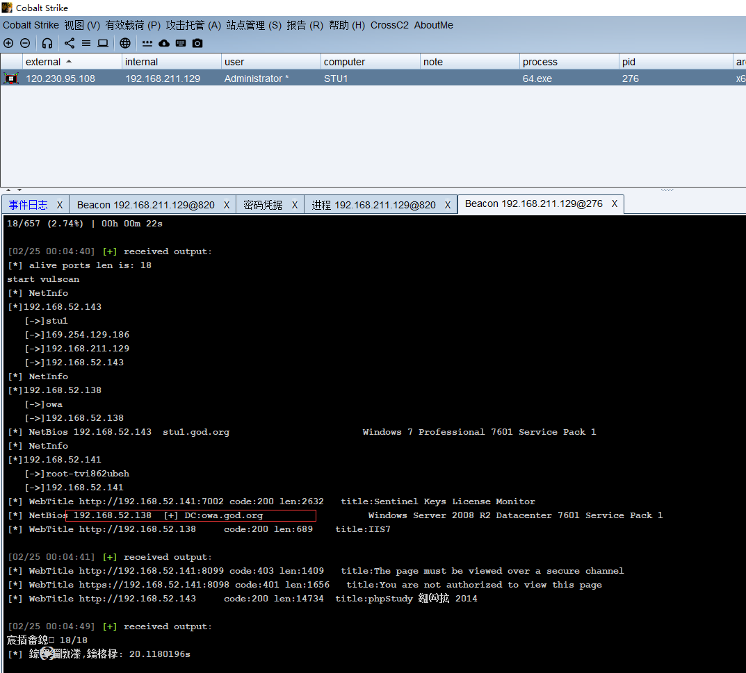 手动添加192.168.52.138目标,psexec64位,使用smb监听器,横向上线DC机器。