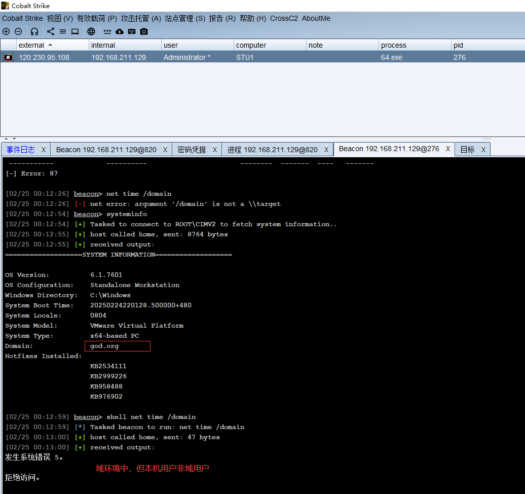 - 发现域【god.org】,本机处于域环境中,但当前用户非域用户。