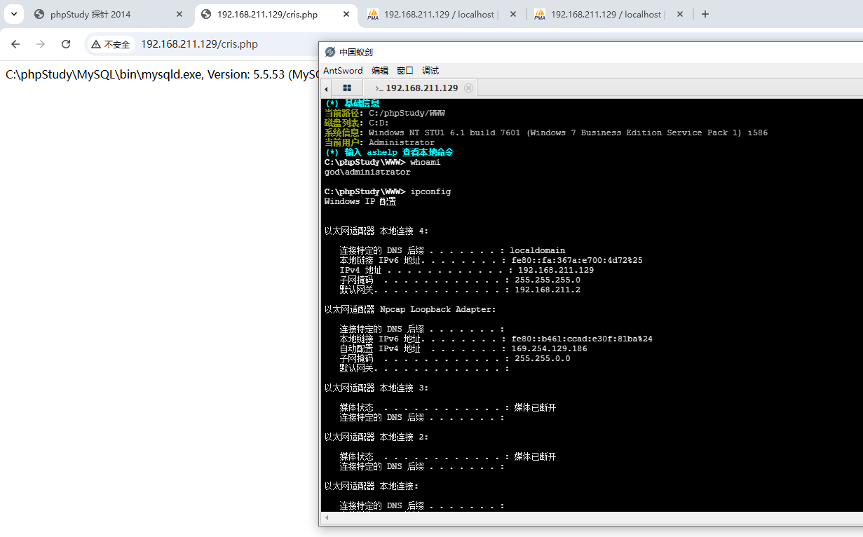蚁剑连接,http://192.168.211.129/cris.php,administrator权限,机器存在双网卡【192.168.52.143】【192.168.211.129】。