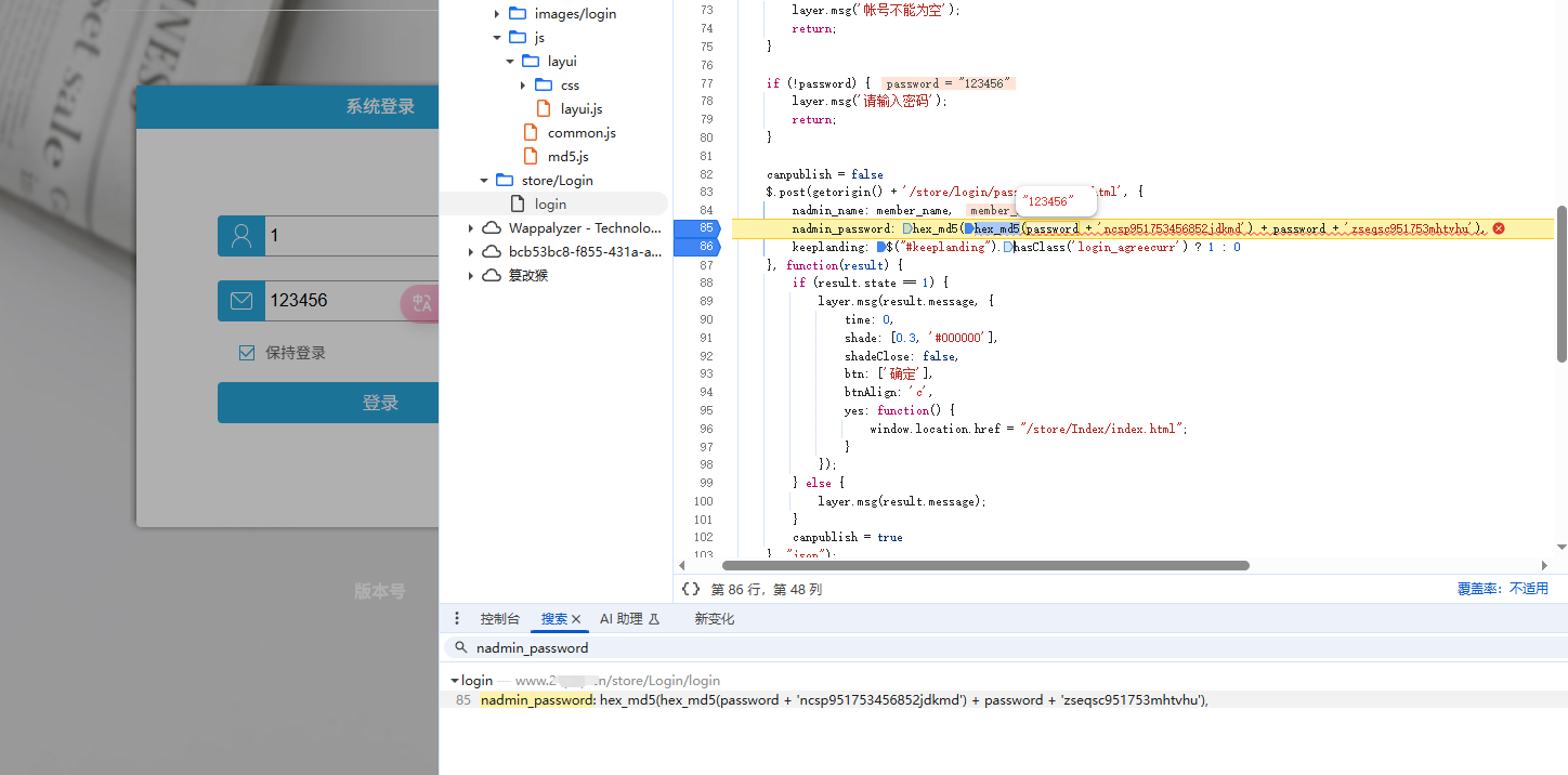 非默认md5加密,逆向分析js加密步骤,调试发现用了md5+Salt加密。分析了当前js未进行魔改,就是原版的md5。