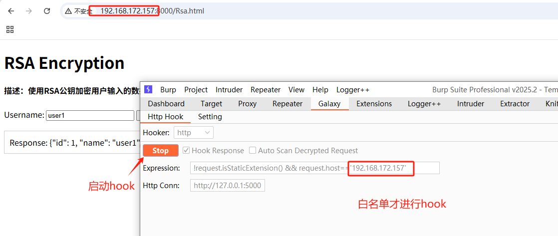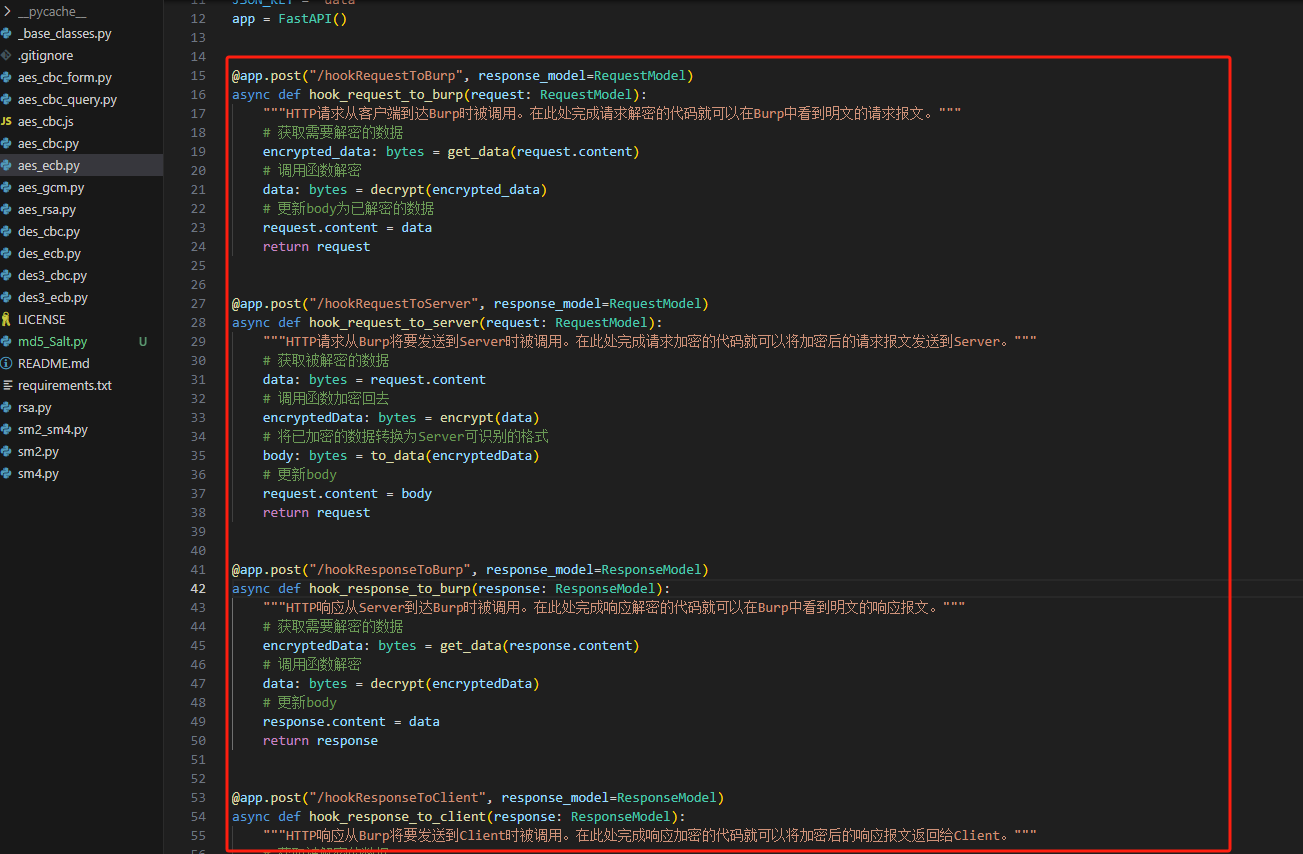 由于是单向加密,根据Burp Suite 和Galaxy的流程图,我们只需要在数据提交到server时(②步骤),进行处理即可,其他默认返回即可。